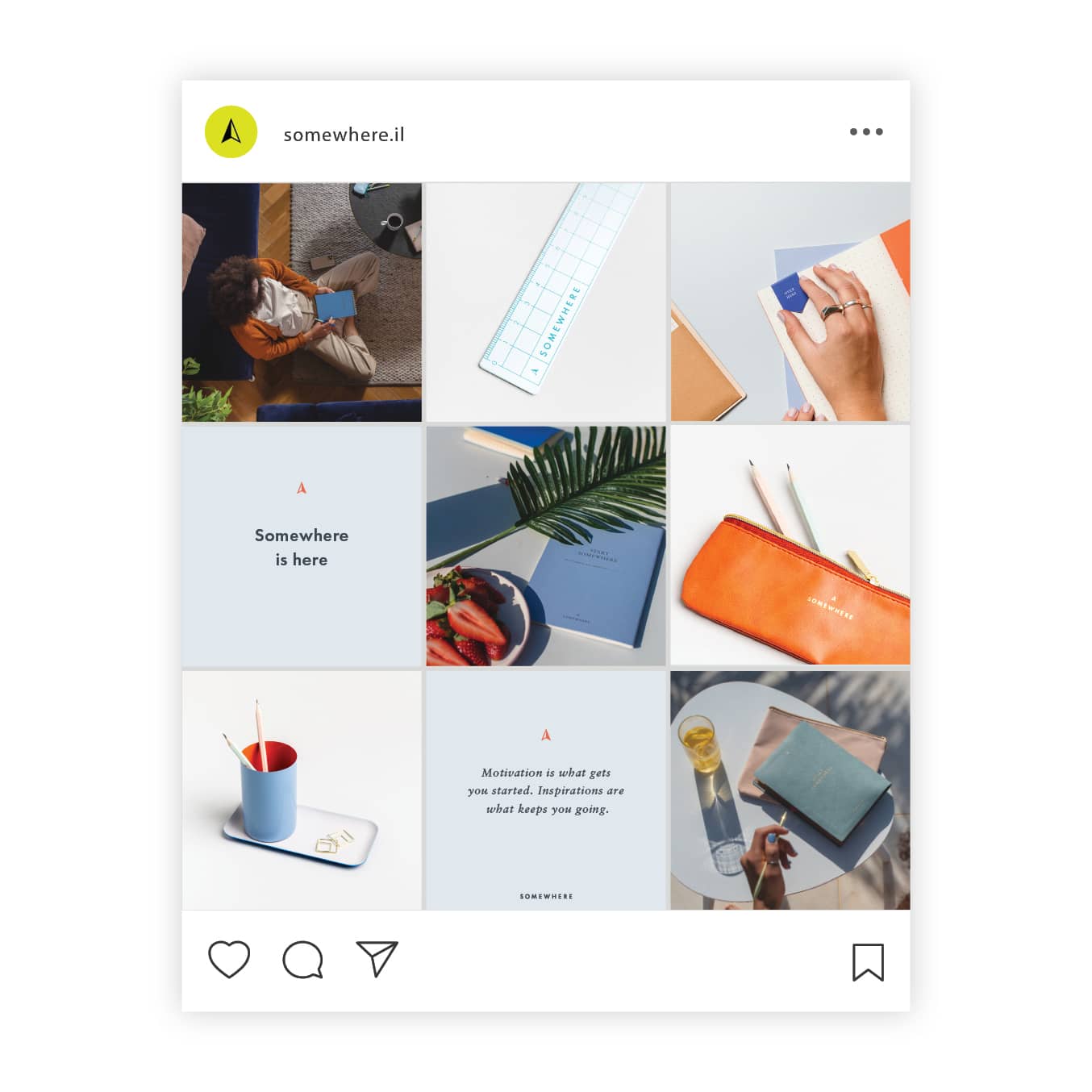 The way people work has changed, and with it, the need for hybrid and flexible solutions. With this consumer insight, we created a new office stationary and accessory brand. Somewhere was created for the worker on the move - to make working days easier and beautiful anywhere one goes. We created a free-spirited brand that breathes creativity and exploration, accompanying every worker on their journey of constant migration.